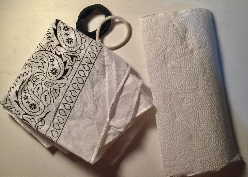 Ya sabiendo las diferencias entre los elementos que se volvieron tan familiares para nosotros, y que si vemos a alguien sin uno puesto nos resulta raro, vamos a ver el paso por paso para poder realizar un tapabocas casero con materiales que tenemos en nuestros hogares. Necesitamos, un pañuelo, dos banditas elásticas y un rectángulo de papel de cocina.