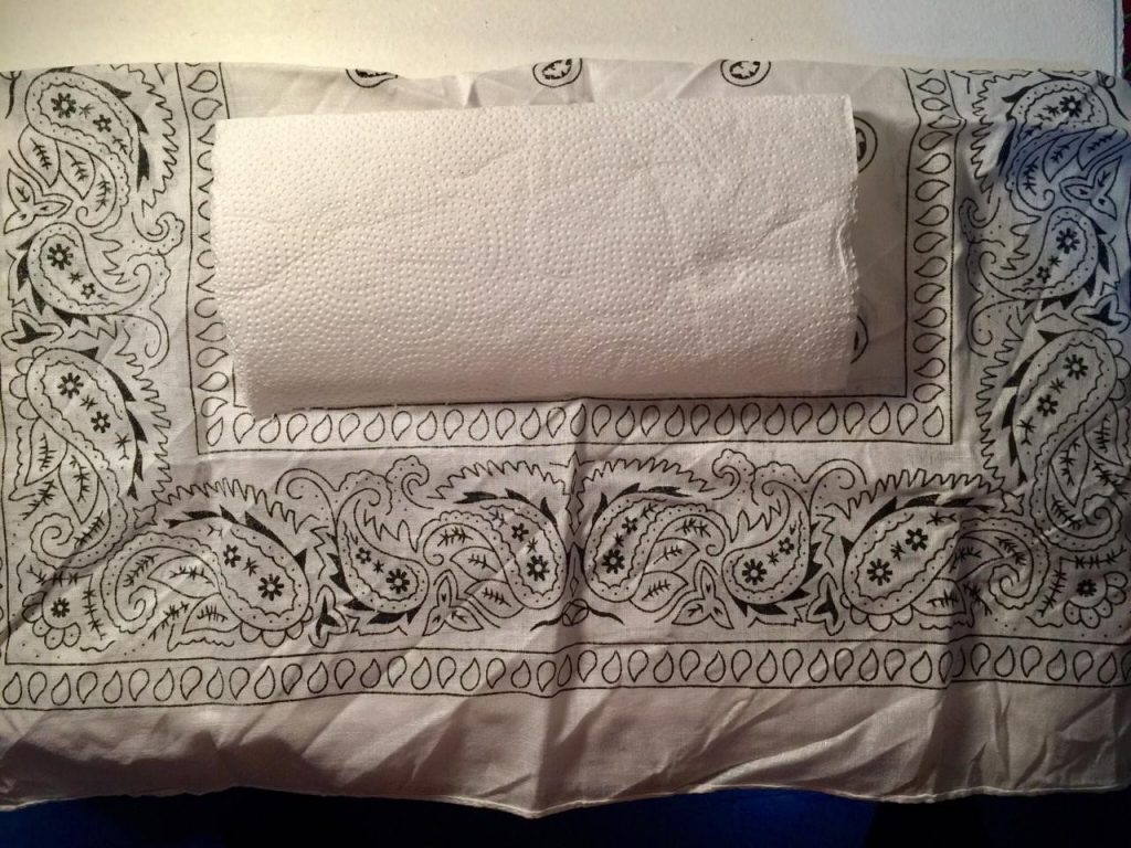 Como primer paso se debe estirar el pañuelo sobre una mesa o superficie lisa, luego doblarlo por la mitad y colocar la servilleta (que va a funcionar como filtro) sobre el pañuelo.