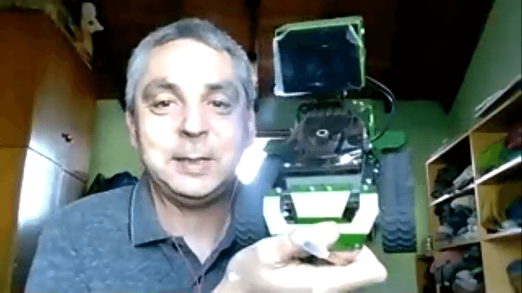 Esto es un minibot. Acá en la placa Arduino podes conectar los sensores que quieras y lo manejas con una aplicación del teléfono vía Scratch. Sirve para aprender a programar. Con esto, podes tener sensores de proximidad, de movimiento y demás. Con el bastón, pusimos una placa parecida a esta puesta en un tubito , una bocinita y un sensor de proximidad, parecido a los de los autos que usas cuando estacionas. Todo esto lo hicimos con los chicos de la secundaria del barrio Arcoiris. Con ese bastón nos presentamos en la feria de ciencia local, para mostrarlo nada más, no para competir. Tiempo después, nos enteramos que la directora nos había metido de prepo en un concurso y tuvimos que ir al Salón Blanco de la Municipalidad a defender el proyecto y a recibir el premio. Ganamos una pizarra digital para la escuela.