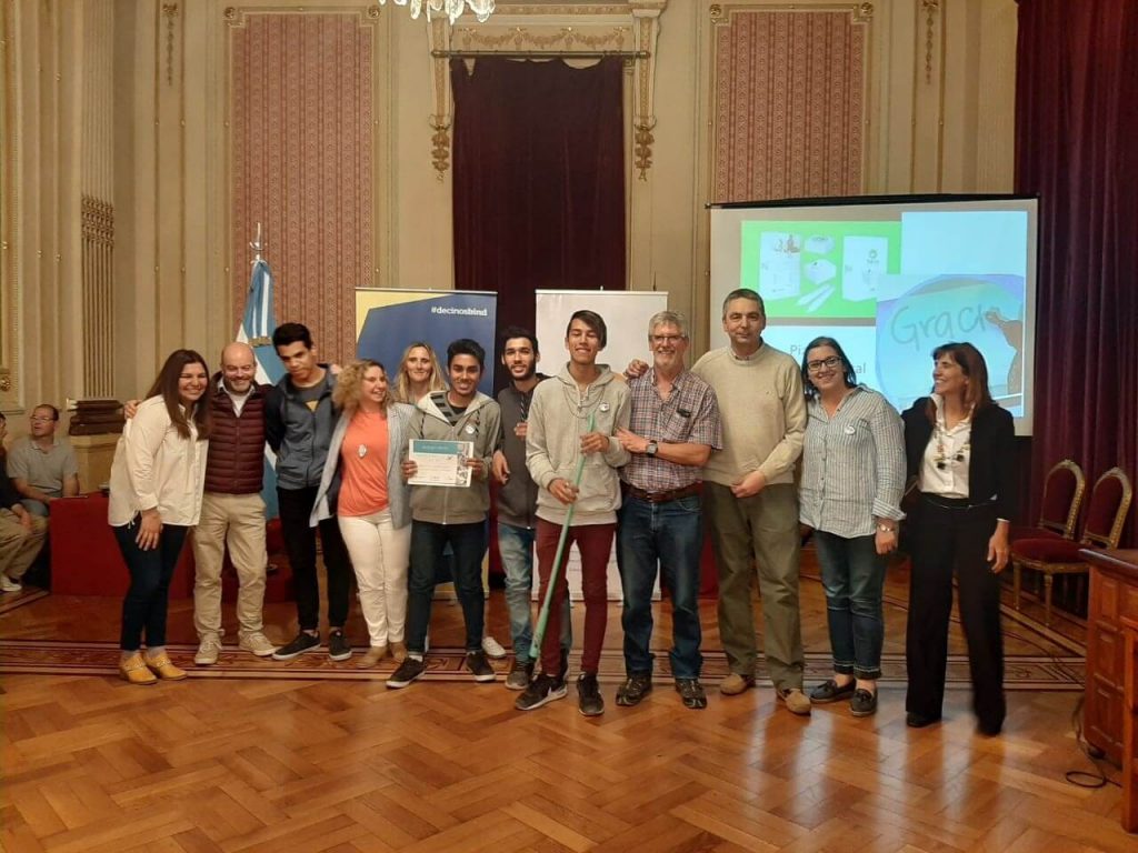 Bernardo junto a otros profesores y alumnos de Secundaria N°7 presentando el bastón inteligente para personas invidentes