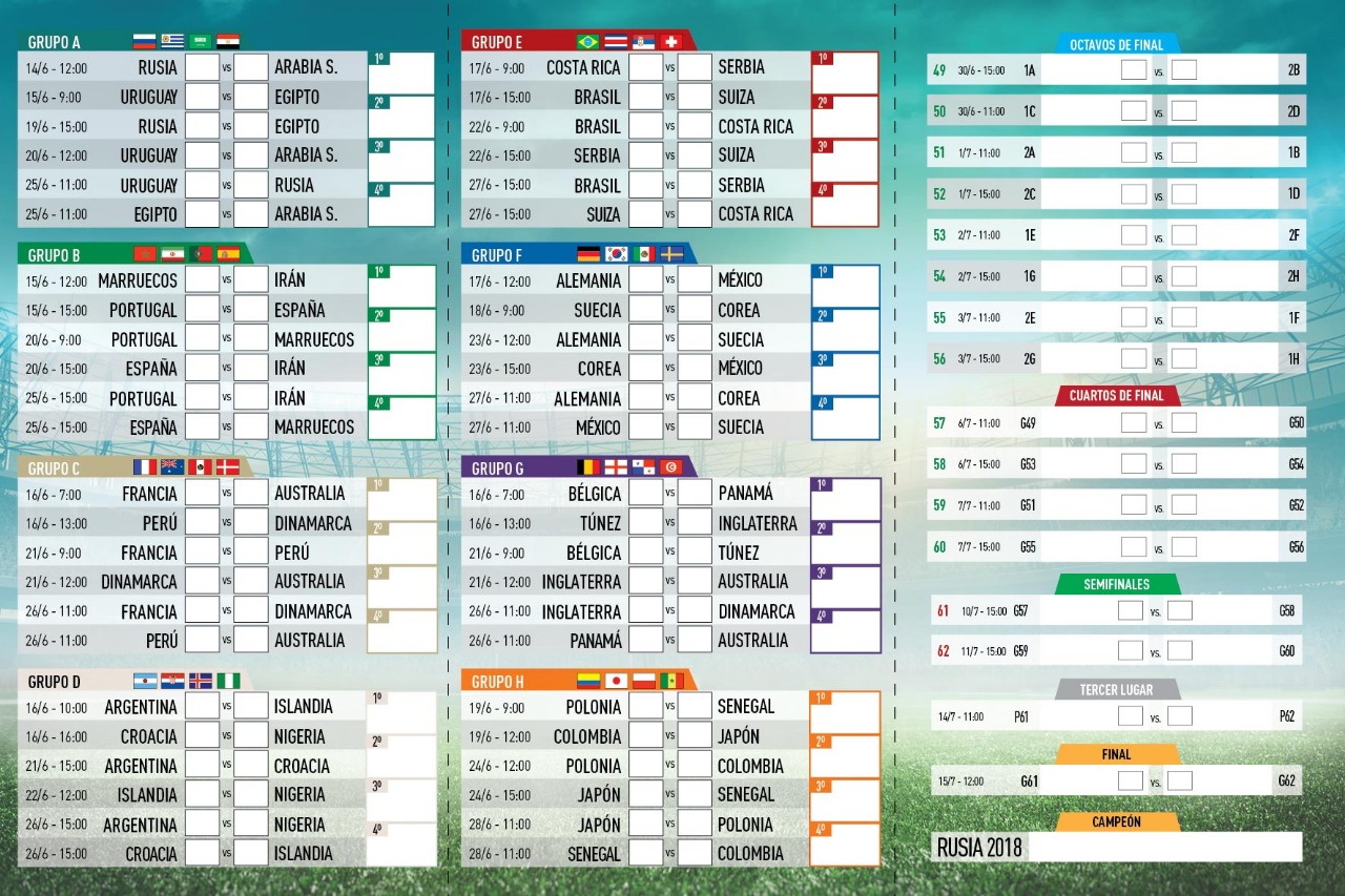Los partidos que la selección jugará con exactitud son por fase de grupo, contra Islandia el sábado 16 de junio a las 10 a.m, contra Croacia el jueves 21 de junio a las 3 p.m. y contra Nigeria el martes 26 de junio a las 3 p.m. (grupo D). Si Argentina pasa a octavos de final, quedando primera en el grupo, juega el domingo 1 de julio y quedando segunda, juega el sábado 30 de junio. Si pasa a cuartos de final, quedando primera en el grupo, juega el sábado 7 de julio a las 11 a.m. y quedando segunda en el grupo, el viernes 6 de julio a las 11 a.m. En semifinales, quedando primeros, juegan el miércoles 11 de julio a las 3 p.m. y quedando segundos, juegan el martes 10 de julio a las 3 p.m. El tercer puesto se juega el sábado 14 de julio a las 11 a.m. y la final el domingo 15 de julio a las 3 p.m. El único partido que se jugaría mientras los alumnos se encuentren en el Colegio sería el de cuartos de final, si es que quedamos segundos en el grupo, eso sería el viernes 6 de julio a las 11 a.m.