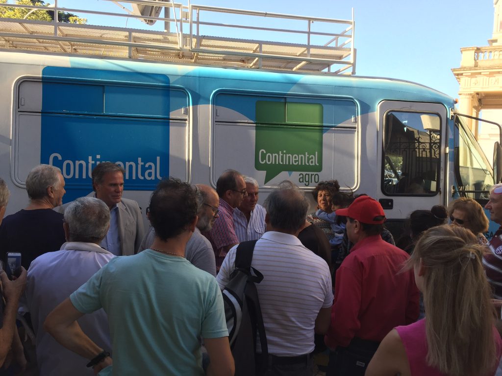 Fernando Bravo rodeado por un grupo de personas, tras el programa que realizó el móvil de Radio Continental frente al Palacio Municipal de Tandil.