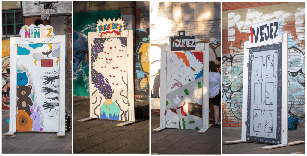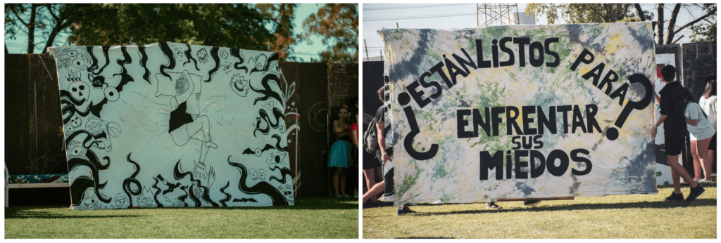De la puesta en escena participaron 85 personas entre las tres escuelas. Cada etapa contaba con dos puertas características. Hubo una cama en la vigilia del sueño donde ocurrieron las pesadillas de la niñez y dos banderas de 2mts x 3mts. Esto acompañado de partes específicas de ambientación correspondientes a cada etapa, por ejemplo, un espejo que fue atravesado por el Miedo, mostrando los complejos que el simple hecho de vernos al espejo puede conllevar.