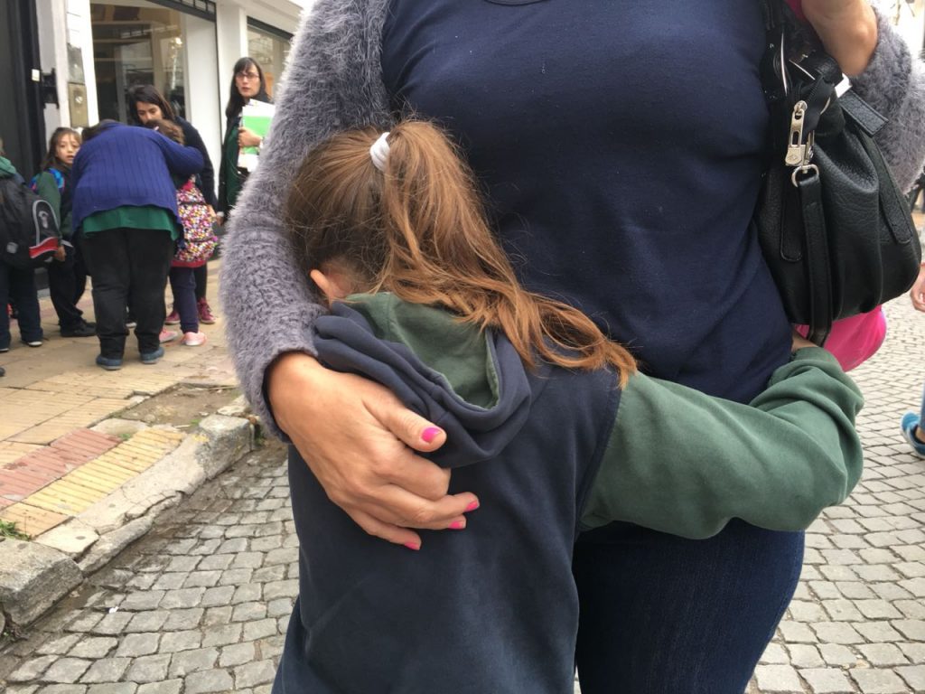 Una alumna de primaria abraza entre lágrimas a su mamá, luego de la amenaza de bomba