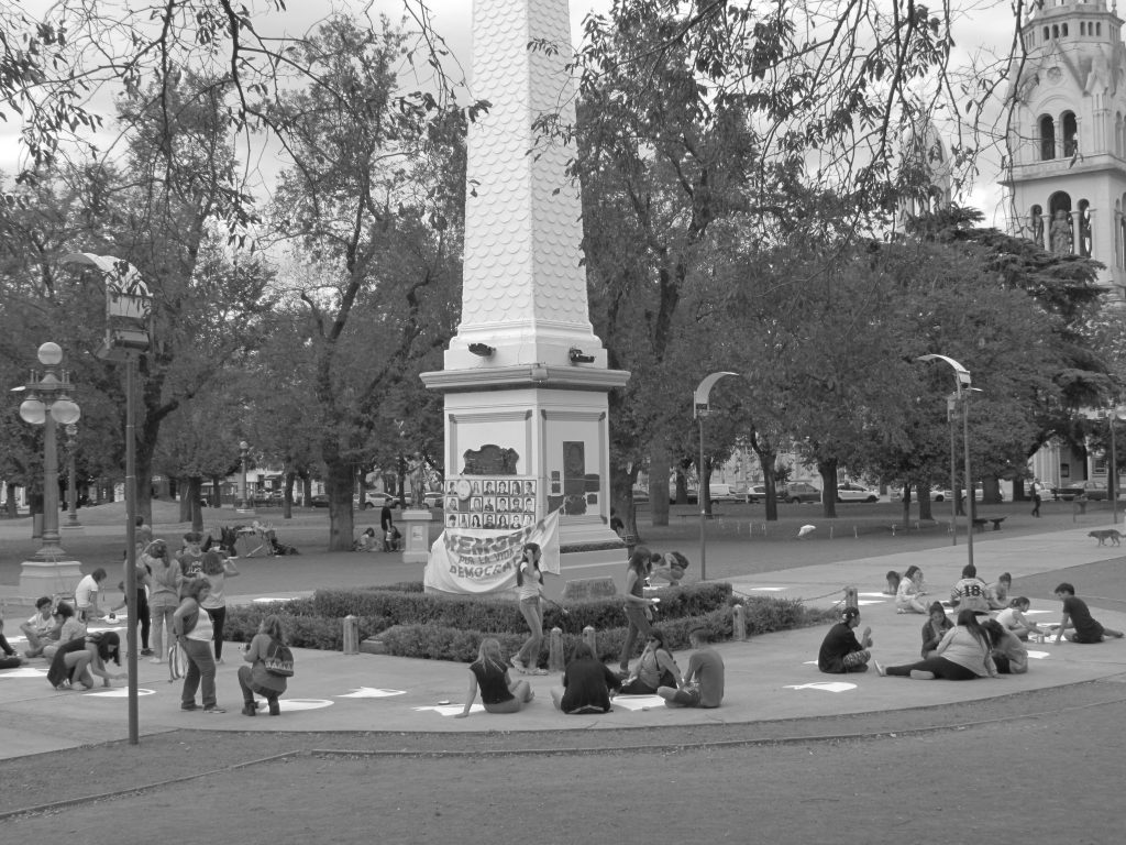 Belén, Polivalente, Técnica 2 y 3, Sábato, ESN18, entre otras. Entre mate y música, los y las estudiantes comenzaron a pintar los pañuelos blancos alrededor de la pirámide de la Plaza Independencia el sábado 17 de marzo a las 11 de la mañana.