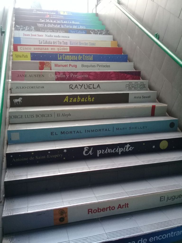 Acercándonos al barrio de Palermo, se podía ver que el ambiente de la FIL ya había impregnado el entorno, desde la estación del subte de Plaza Italia, los escalones simulaban ser libros ya que tenían en su alzada plotters con títulos como, Orgullo y Prejuicio, El principito, Azabache, etc., en el piso del andén había una rayuela, haciendo referencia al famoso libro de Julio Cortázar y por todos lados había también diferentes carteles con invitaciones a la feria de una forma inusual y muy cercana.