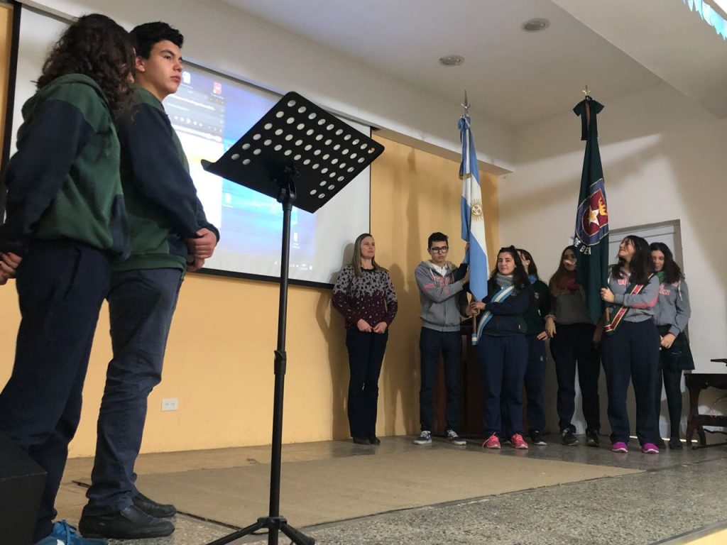 Primero se realizó el acto en secundaria, a las 9 de la mañana. Se dio paso a las Banderas de Ceremonia, siendo estas portadas por Luciana Anchoverri, Nicolás Carciochi y Florencia Prychodko (Bandera Nacional) y Abril Sánchez, Eugenia Griffioen y Damiana Bartel (Bandera del Colegio), y una vez presentes ambas, se entonó el Himno Nacional, y luego el Himno de los Colegios Evangélicos.