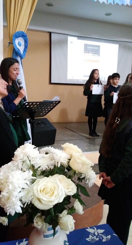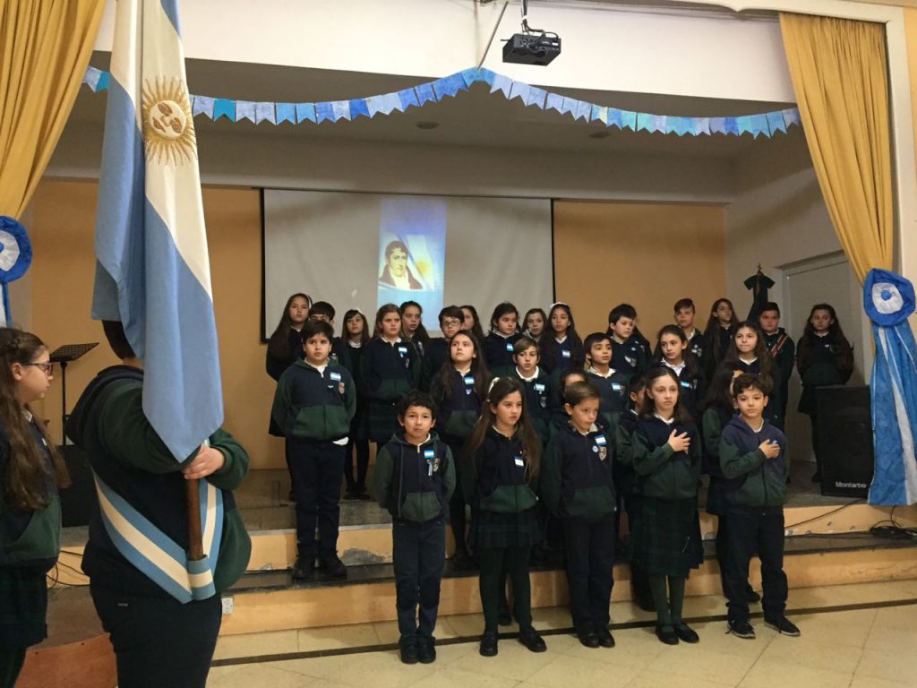 Después de la canción, llegó el momento más esperado. Los chicos y chicas, en la misma posición en la que cantaron la canción, escucharon a la directora del Colegio Primario, Roxana Luján, leer el protocolo a partir del cual los alumnos prometerían lealtad a la Bandera Nacional Argentina, y mientras cada alumno recibía su diploma y los familiares sacaban fotos, detrás se proyectaba un vídeo en el cual ellos mismos sostenían banderas que tenían adentro una frase de Belgrano.