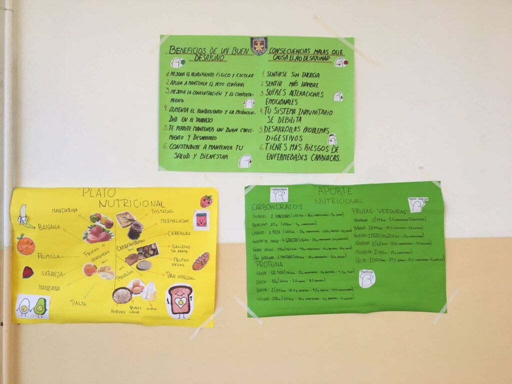 En algunas láminas se habló de los beneficios de un buen desayuno: Mejora el rendimiento físico y escolar, ayuda a mantener el peso corporal, aumenta el rendimiento y la productividad en la vida diaria y contribuye a mantener tu salud y bienestar. Y luego de las consecuencias del no desayunar: sentirse sin energía, sentir más hambre, sufrir alteraciones emocionales, desarrollar problemas digestivos y tener más riesgo de enfermedades cardiacas.