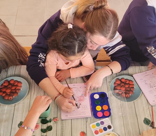 Una de las alumnas con una nena del hogar, pintando unos libros, creados especialmente para ellos