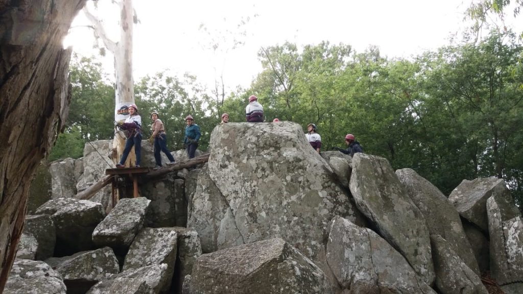 Y la tirolesa es una polea suspendida por cables montados en un declive o inclinación. Se diseñan para que sean impulsados por gravedad y deslizarse desde la parte superior hasta el fondo mediante un cable, usualmente cables de acero inoxidable. Las tirolesas se encuentran en diferentes formas y a menudo son empleadas para entrenamiento. En este caso los chicos disfrutaron de dos tirolesas de 80 mts aprox cada una conectadas por una plataforma en un árbol.