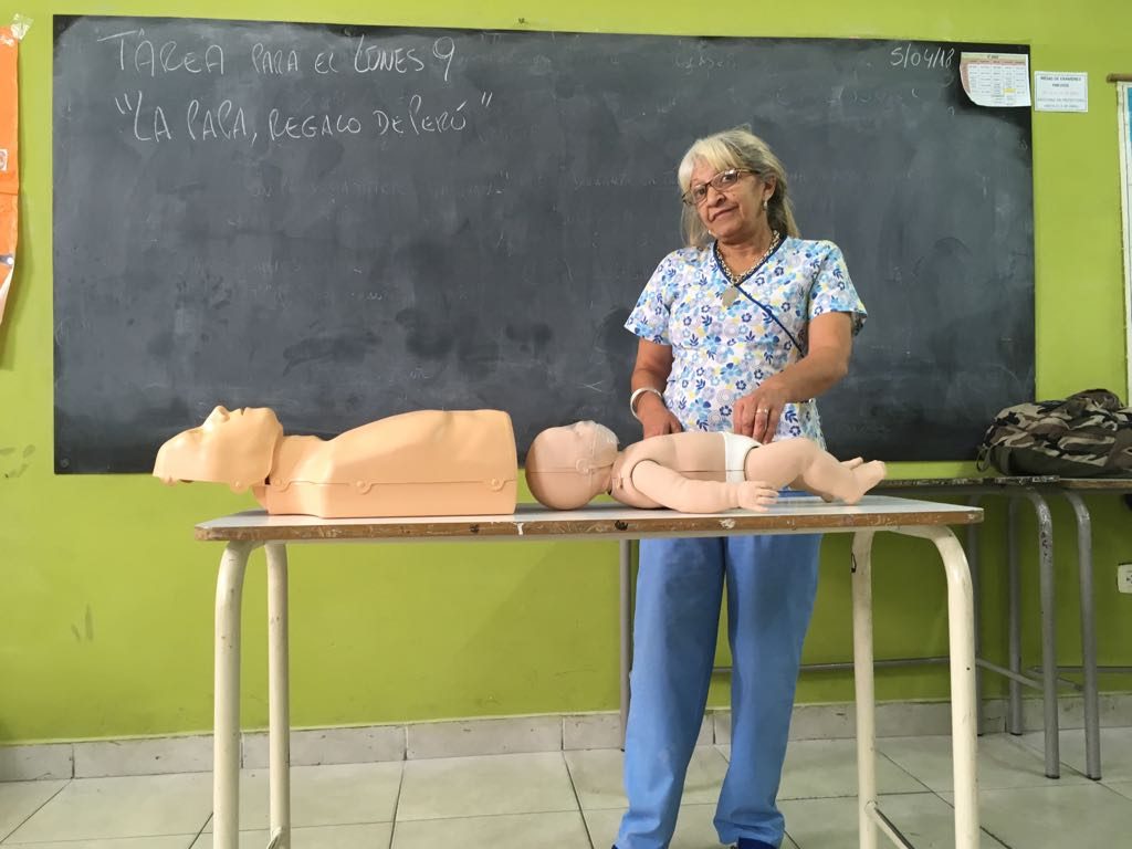 Luego, llegó el momento de explicar los pasos para comenzar a realizar esta técnica. Graciela trajo dos muñecos para hacer la demostración, uno de un bebe y otro del torso de una persona adulta. A medida que pasaba el tiempo se sentía buena onda, los alumnos mostraron muchas ganas de querer aprender, y se generó un ambiente de preguntas y respuestas con mucho respeto.