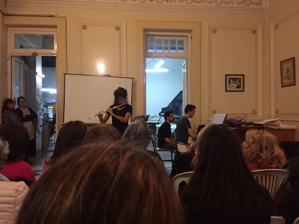 Después, un dúo de profesores de piano, Alejandro Fernández y Ángel Díaz, tocaron a cuatro manos la danza rumana “Slava Dvorak” (OP. 72 N°2 y N°8). Luego, pasó el alumno graduado Lucas Lenzi, y la profesora Juliana Miojedik, una de las más jóvenes del Conservatorio. Ellos tocaron “Cantabile et Presto” de George Enesco, Lenzi en piano y Mihojevic en flauta traversa. Y para terminar, el cuarteto de guitarras, de los profesores Ramírez, Suárez, Mortara y Navarro, que tocaron “El choclo” de Ángel Villoldo y “Libertango” de Astor Piazzolla.